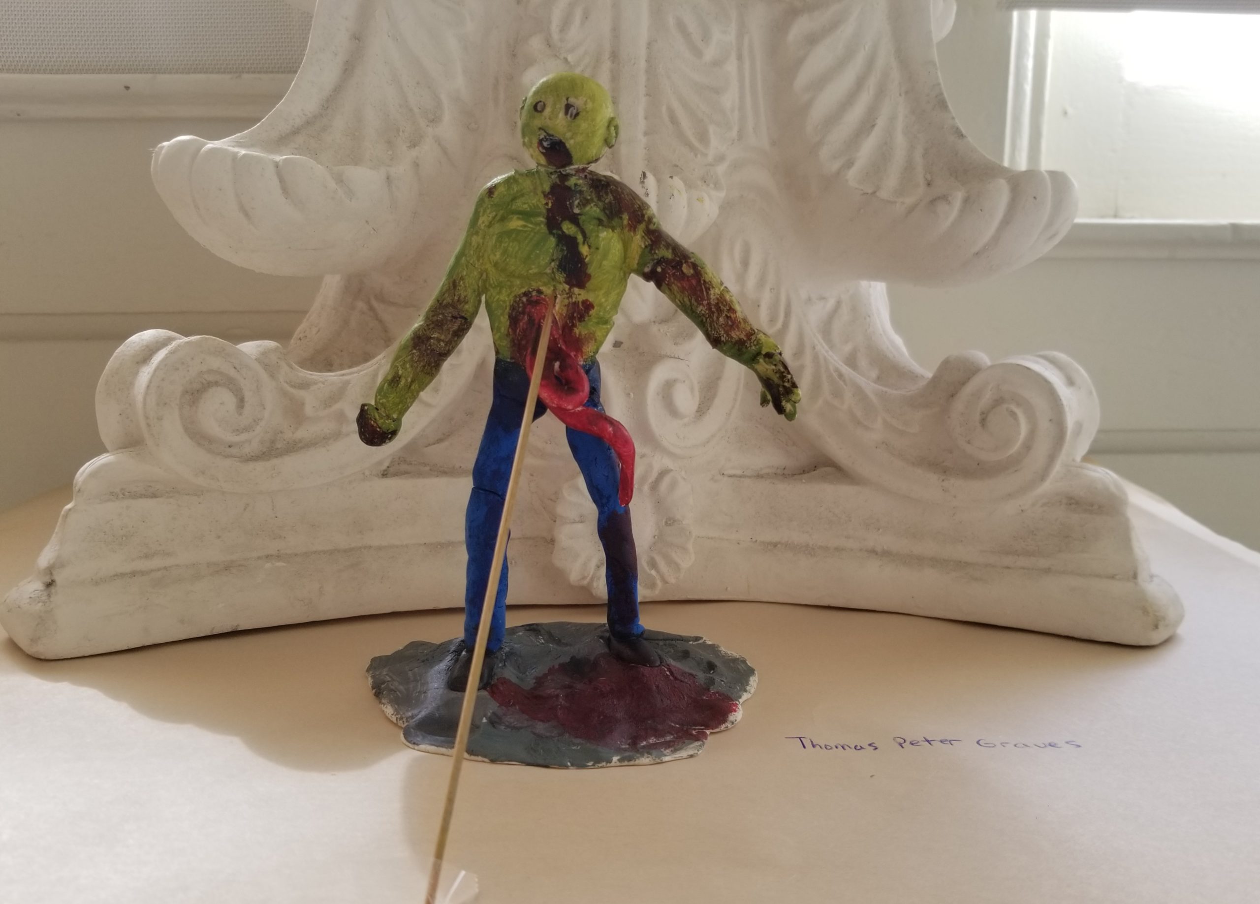 Thomas Graves, Tom’s Zombie Published July 30, 2021 at 2560 × 1837 in Gallery Room 2: 2021 “New Normal: Learning From the Past to Move Forward Together” Artist: Tom Graves Size: Not Available Medium: Model Magic Date: July 2021 Title: Tom’s Zombie Retail value: NFS